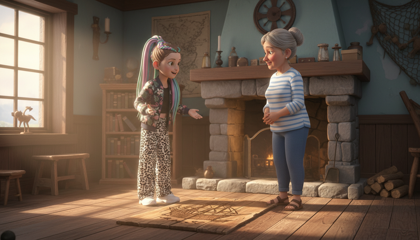 Емілія та Кролик побігли до Тітки Софії, яка саме поралася біля каміна. "Тітко Софіє! Ми знайшли!" – закричала Емілія. Тітка Софія, з теплою усмішкою, підняла погляд. "Що ж ви там знайшли, мої маленькі дослідники?" Емілія показала їй напис. "Ох, "Морський Спів"!" – зітхнула тітка Софія. "Це був старовинний корабель, що зник багато років тому з вантажем музичних інструментів. Але пам'ятайте, море може бути небезпечним. Безпека на воді — це найголовніше!"