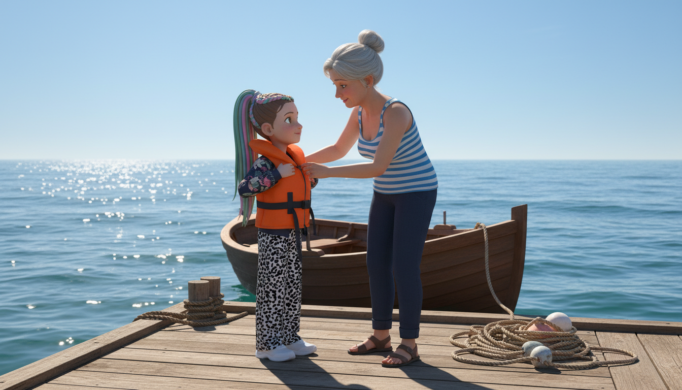 Наступного ранку всі зібралися на причалі. Свіжий морський вітер лоскотав обличчя. Тітка Софія подала Емілії яскраво-помаранчевий рятувальний жилет. "Він трохи великий, але надійний!" – сказала вона. Емілія обережно одягла жилет, а Кролик смішно крутився навколо, намагаючись теж поміститися у свій маленький жилет. "Ось так, молодці! Безпека перш за все!" – похвалила тітка Софія.